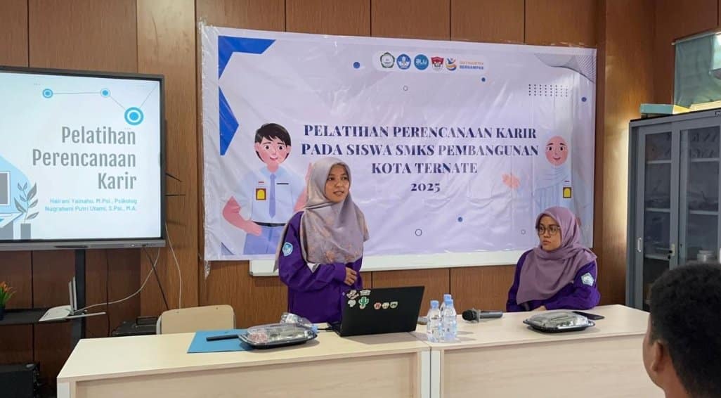 TernateNews, Ternate: Dalam rangka membekali generasi muda dengan keterampilan perencanaan masa depan yang matang, dua dosen Psikologi dari Fakultas Kedokteran dan Ilmu Kesehatan (FKIK) Universitas Khairun, Hairani Yainahu, S.Psi., M.Psi., Psikolog, dan Nugraheni Putri Utami, S.Psi., M.A., menggelar pelatihan perencanaan karir di SMKS Pembangunan Kota Ternate pada Rabu, (29/7/2025).
